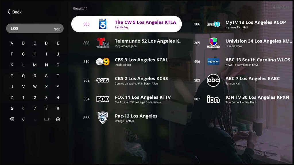 Click “OK” on your remote to open Normal EPG, you can see the search section on the top of channels section. You can search your wanted channel name, by searching part of the channel name or location name, e.g. Telemundo 52 Los Angeles KVEA, you can search “Tele” or “Telemundo” or “Los Angeles” or “KVEA”.